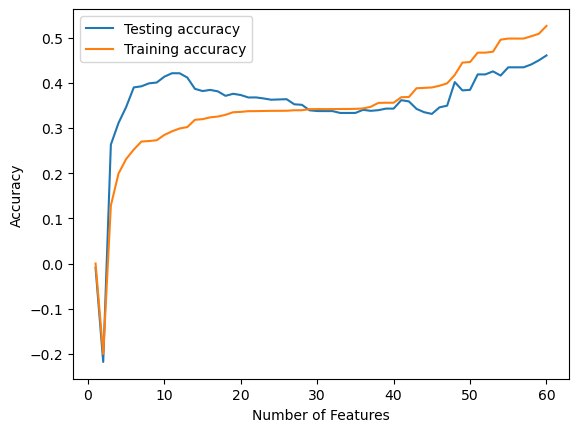 Below, we create an array to store the score that is produced with each different number of features used in the model as selected by our RFE. We use a for loop to loop through each value from 1-60 and display the score at each iteration in a graph. What we see from the graph, is even with using fewer features, our score never gets above around 45%. The best scores come around 12-15 features and 55-60 feautres. Even still, the scores at these points aren’t very good. Although we were hoping linear regression would perform well on our dataset, it doesn’t appear to be the case. Because of this, we are going to implement a random forest tree to see if we can obtain a better validation score on our dataset.