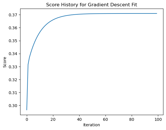 labels = plt.gca().set(title = "Score History for Gradient Descent Fit", xlabel = "Iteration", ylabel = "Score")