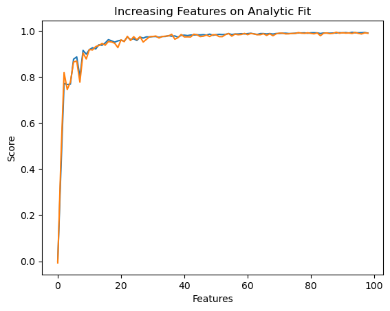 labels = plt.gca().set(title = "Increasing Features on Analytic Fit", xlabel = "Features", ylabel = "Score")